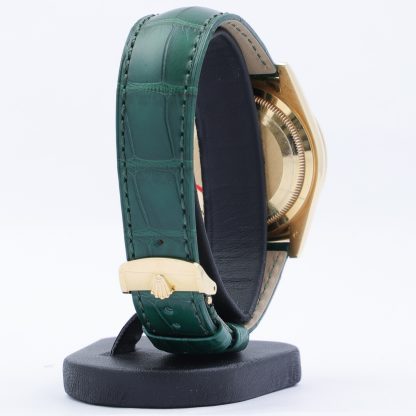 An iconic Rolex watch with a clear Rolex design language. This Day-Date 36 reference 118138 is presented with a striking green sunburst dial with a green alligator leather strap. The green color pairs perfectly with the yellow gold of the case. The watch comes with box and papers dated 2014. It is in excellent pre-owned condition and has never been polished.