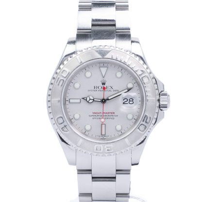 A classic and sporty Rolex Yacht-Master reference 16622 complete with box and papers dated 2003. The watch is in overall good condition with natural signs of wear. It is presented on a stainless steel Oyster bracelet and has a platinum dial with a stunning luster and sheen as light hits it. It is also equipped with a bidirectional rotating bezel with a platinum insert.