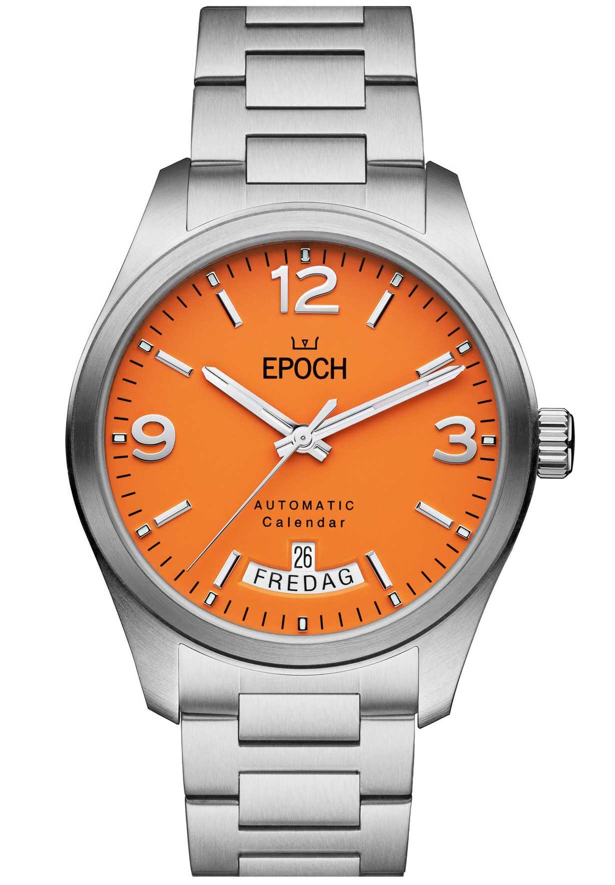 The Automatic Calendar silver is based on the limited edition orange Automatic Calendar, but is part of Epoch’s standard collection and thus not limited. It is presented with a more discreet and classic – yet equally beautiful – brushed silver dial which makes this watch suitable for any occasion and outfit.